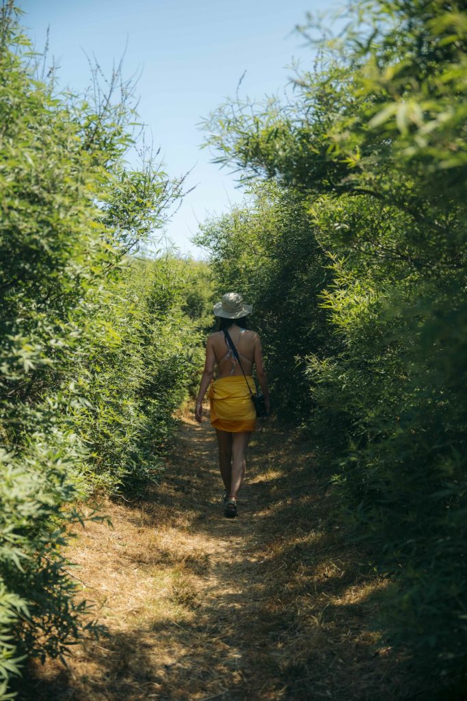 Πιο πίσω, το παραποτάμιο δάσος με πλατάνια, καλαμιές και τον ποταμό Άχλα δημιουργεί έναν ζωντανό διάδρομο δροσιάς και σκιάς. Ο υδροβιότοπος, με τη σπάνια ορνιθοπανίδα του, συμπληρώνει το σκηνικό με ήχους που σε καλούν να παρατηρήσεις το φυσικό σύνολο. Εδώ, η κάθε στιγμή έχει σημασία. Γι’ αυτό και το summer kit που έχω επιλέξει να με συντροφεύει, καθώς εξερευνώ κάθε γωνιά αυτής της ακτής, είναι ο τρόπος μου να ενταχθώ στο τοπίο χωρίς να το διαταράξω.