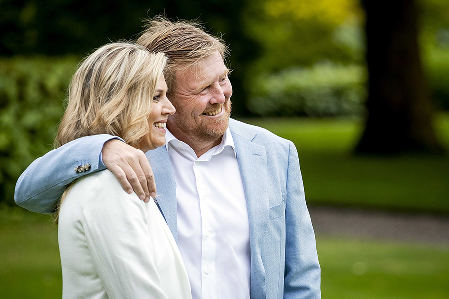 Η φωτογραφία δείχνει τον βασιλιά Βίλεμ-Αλεξάντερ να φορά πουκάμισο με σηκωμένα μανίκια και να κρατά τη μάσκα στο χέρι. Στο πλευρό του η σύζυγός του Μάξιμα, χαμογελαστή, και δίπλα της ένας άλλος άνδρας.
