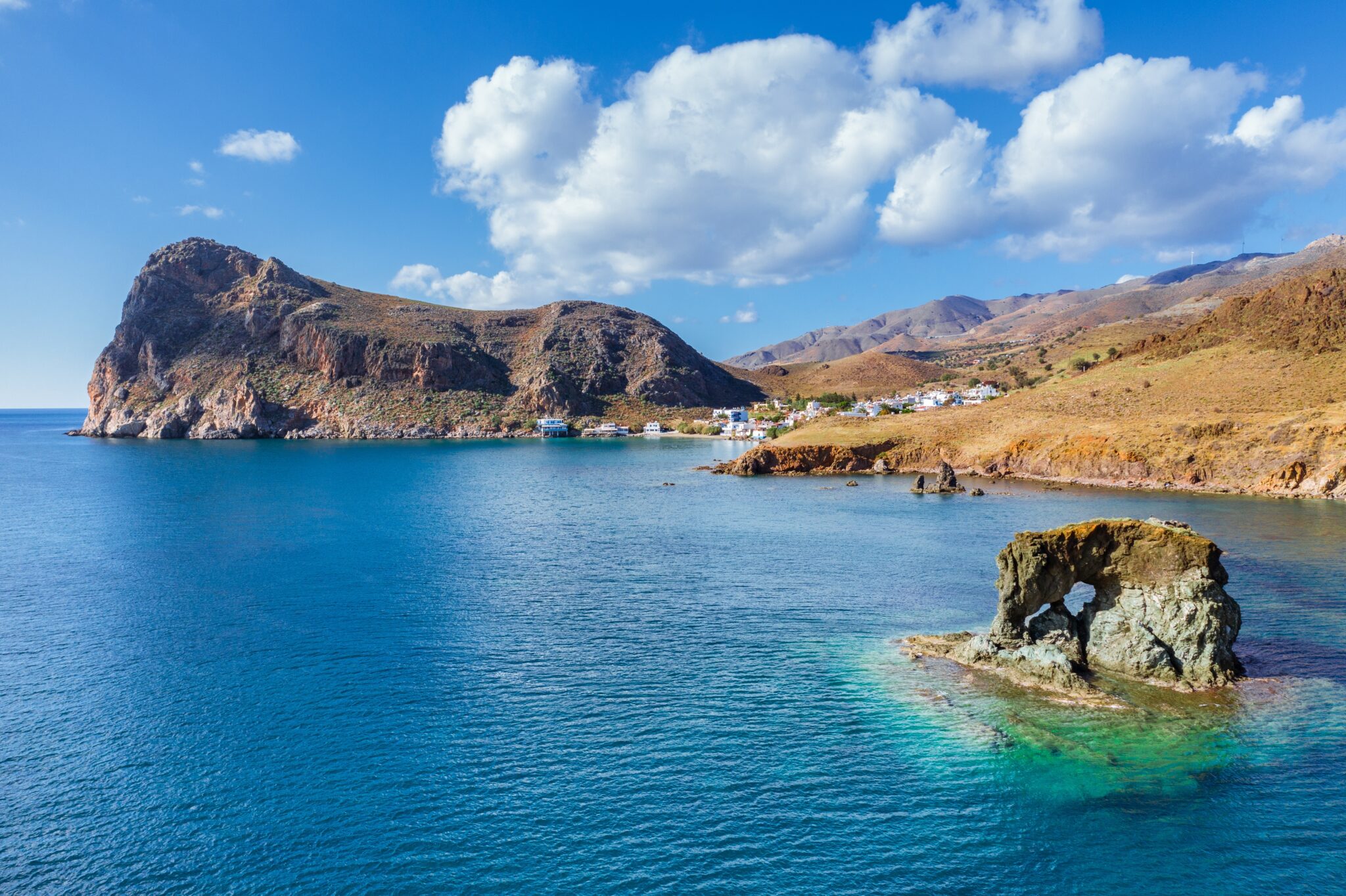 In the sheltered bay of Keratokambos, and 50 minutes south of Heraklion, Kastri is the port for the wider Viannos region. With sand and pebbles, it is unorganised but the village is nearby for tavernas and cafes. To the west is Skouros, named after the islet opposite. Bigger with finer sand, it is popular with boat owners and day-trippers from Heraklion.