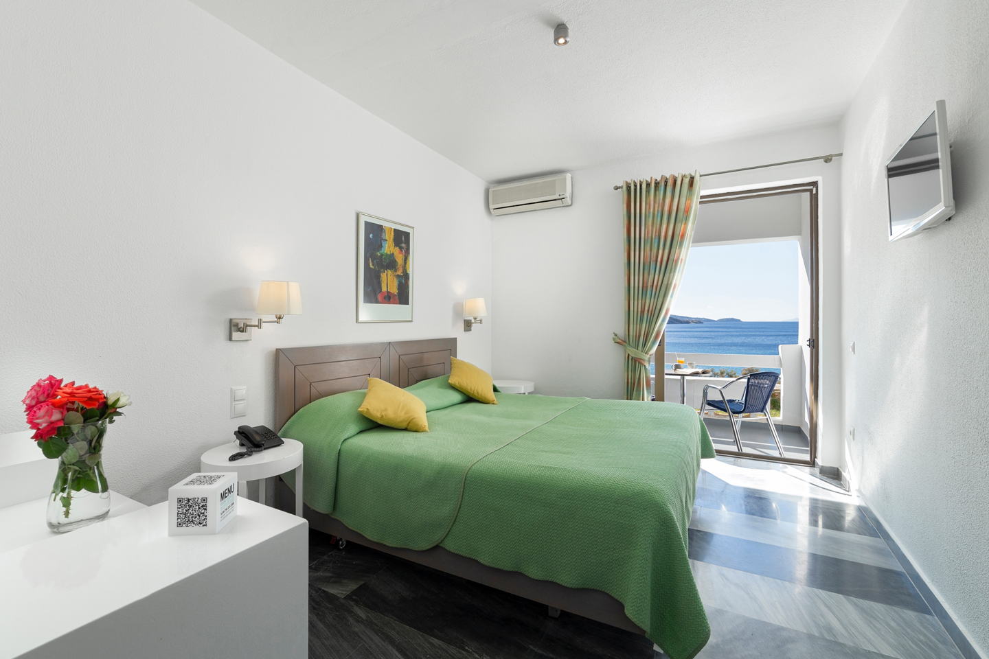 Hotel Perrakis rooms in Andros are spacious and bright, with balconies all facing the sea. The elegant decoration and the carefully chosen furnishings give a special quality to your stay. Choose from 3 types of rooms that accommodate 1 to 4 guests. Enjoy our amenities along with our daily cleaning service that follows specific sanitary protocols and relax stress free.