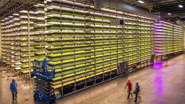 Instead of relying on sun and soil like a traditional farm, AeroFarms grows its produce year-round in rooms with 40-foot-tall ceilings using LED lights and cloth made from recycled water bottles.
